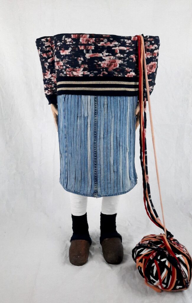 Son travail part du matériel vêtement abimé et prêt à jeter qu’elle décompose et recompose en un fil permettant de mettre en avant les couleurs et les textures et sur lequel elle pose un regard. Celui-ci s’intègre dans une démarche artistique sensibilisée par l’impact environnemental de l’abondance de matériaux/déchets dont les qualités physiques (réfléchies par l’industrie) attisent son intérêt.